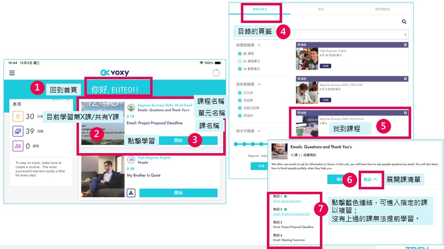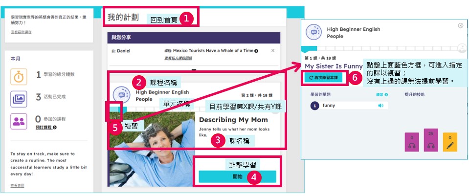 回到首頁,可以點擊該單元的藍色方框處,即可再次學習。